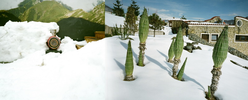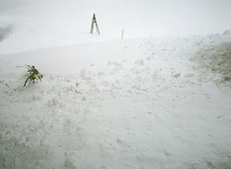 Im Gegensatz zur vorauseilenden medialen Abfeierung der Winterolympiade 2014, der größtes Entwicklungspotential für die Region Sotschi zugeschrieben wird, und die dort auch umfangreichste Bau- und Infrastrukturmaßnahmen in Gang gesetzt hat, hat sie von ihrer Reise etwas Anderes mitgebracht. Bilder, die die BetrachterIn sonderbar rühren können. Auf einem davon ist nicht viel mehr zu finden, als eine unklar strukturierte Schneefläche, ein paar Klumpen Schnee verteilt auf einer Fläche Schnee, ein winziges schief stehendes Bäumchen, ein roter Stab der im Schnee steckt, drei Stangen die zu einer nicht deutbaren Konstruktion zusammengefügt sind. Sonderbare Bedeutungslosigkeit, die den Betrachter verloren und ohne Anhaltspunkt zurück-lässt. Zurückwirft auf ein Selbst, das in der Betrachtung nicht weiß, wo es hin soll. Damit lässt sich das nachvollziehen was für die Fotografin das dominante Gefühl in der Baustellenlandschaft der Skigebiete nahe Sotschi war. Sie fühlte sich fehl am Platz, allerdings nicht angesichts der mächtigen Berglandschaft, die leicht ein Gefühl der Verlorenheit hervorrufen kann, sondern angesichts dessen, dass sie hier in einem für TouristInnen ausgerichteten Gebiet nicht das Gefühl hatte, willkommen geheißen zu werden. In Laternen sind 360-Grad-Überwachungskameras versteckt, überall lehnt Wachpersonal herum – während Ihres Besuches gab es einen Bombenanschlag auf eine der Seilbahnen im Elbrus-Skigebiet. Es sind unterschiedlichste Spuren, die sie in ihren Bildern verfolgt, um diesem Gefühl Ausdruck zu verleihen. Ein Gefühl, das sich aussetzt und Fragen stellt, dort wo es keine leicht zugänglichen Informationen und Antworten gibt, das aber dennoch versucht, etwas sichtbar zu machen.