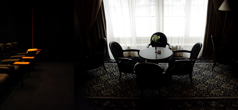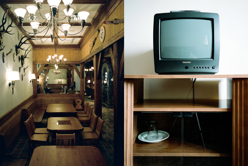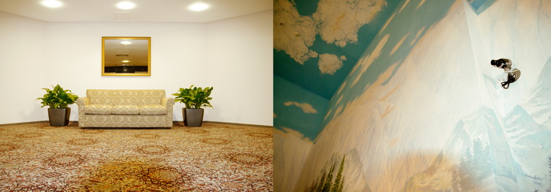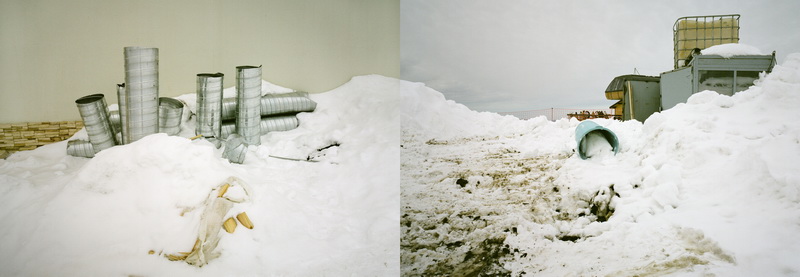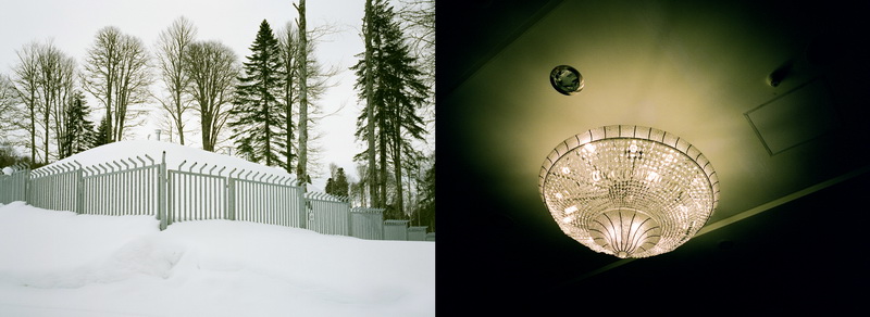 Ein Diptychon : Auf der linken Seite finden wir einen massiven Zaun aus senkrechten Eisenstäben in rechteckigen Rahmen. An der Oberkannte des Rahmens richten sich abgewinkelte Metallstangen wie Periskope oder Hörner dem Ausserhalb dieses Zaunes entgegen. Die einzelnen Kompartimente des Zauns staffeln sich von linken Rand des Bildraumes nach vorne in eine Ecke, die sich der BetrachterIn entgegenstellt und sich dann nach rechts in eine unbegrenzte Tiefe zurückzieht. Davor befindet sich eine Schneefläche, bei der durch das diffuse Licht nicht klar ist, wie sie sich formt, die keinen Aufschluss darüber gibt, wo die BetrachterIn steht, die praktisch das Bild von ihr abschneidet. Wahrscheinlich innerhalb des Einschlusses, den der Zaun bildet, ragen Bäume hoch, die wie eine Langzeitbelichtung bei Nacht wirken, gespenstisch aufragen und wie ferne übermächtige Riesen erscheinen. Am rechten Bild des Diptychons finden wir einen Luster, der sich in einer konvexen Form von der Decke herunter wölbt. Er ist es, der Licht gibt, das aber nur als ein Halo in einer leichten Verschiebung rund um ihn herum wahrnehmbar ist. Rundherum ist es dunkel. Ein Luster, der nicht klar macht, ob er aus kostbarem oder billigem Material ist, der aber eine mondäne Repräsentationsgeste darstellt. Er hängt, hier kommt eine nicht aus dem Bild ablesbare Information herein, in einem Luxushotel. Ein Luxushotel, das in der Konfrontation mit dem ausschliessenden Charakter des Zaunes – der ein Gelände von Gazprom eingrenzt - sofort auch selbst eine ausschließende Qualität bekommt.